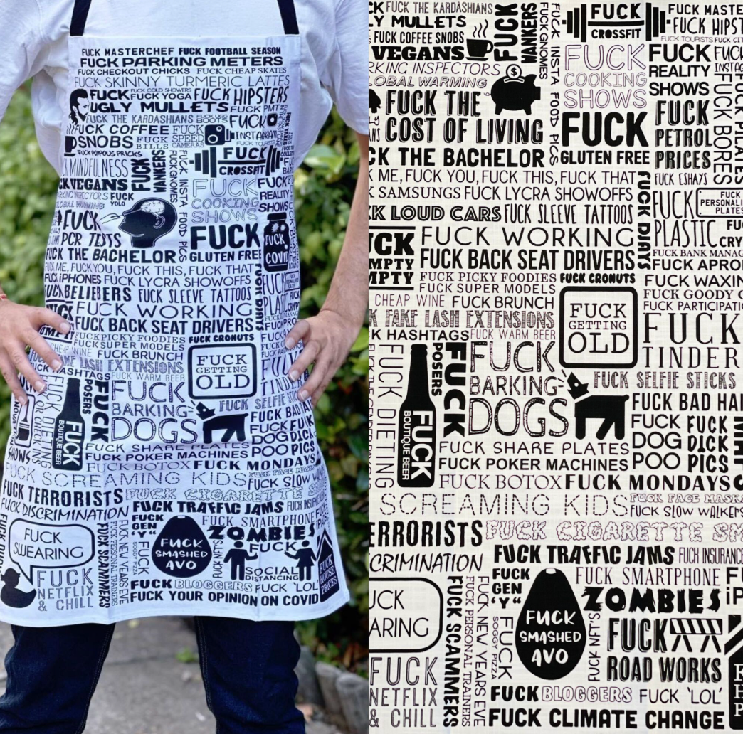 Funny F word unisex apron and tea towel combo that's bound to be a hilarious conversation starter at your next BBQ party or Family Get Together. Perfect for gifting to someone with a quirky sense of humour.